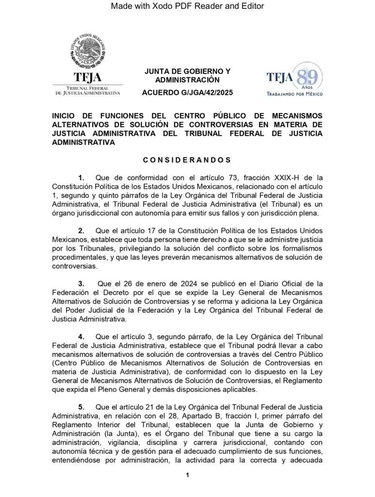 El Tribunal Federal de Justicia Administrativa ha dado un paso trascendental en la consolidación de la justicia alternativa en materia administrativa. Mediante el Acuerdo G/JGA/42/2025, se determinó el inicio de funciones del Centro Público de Mecanismos Alternativos de Solución de Controversias, con sede en la Ciudad de México, a partir del 1 de octubre de 2025.